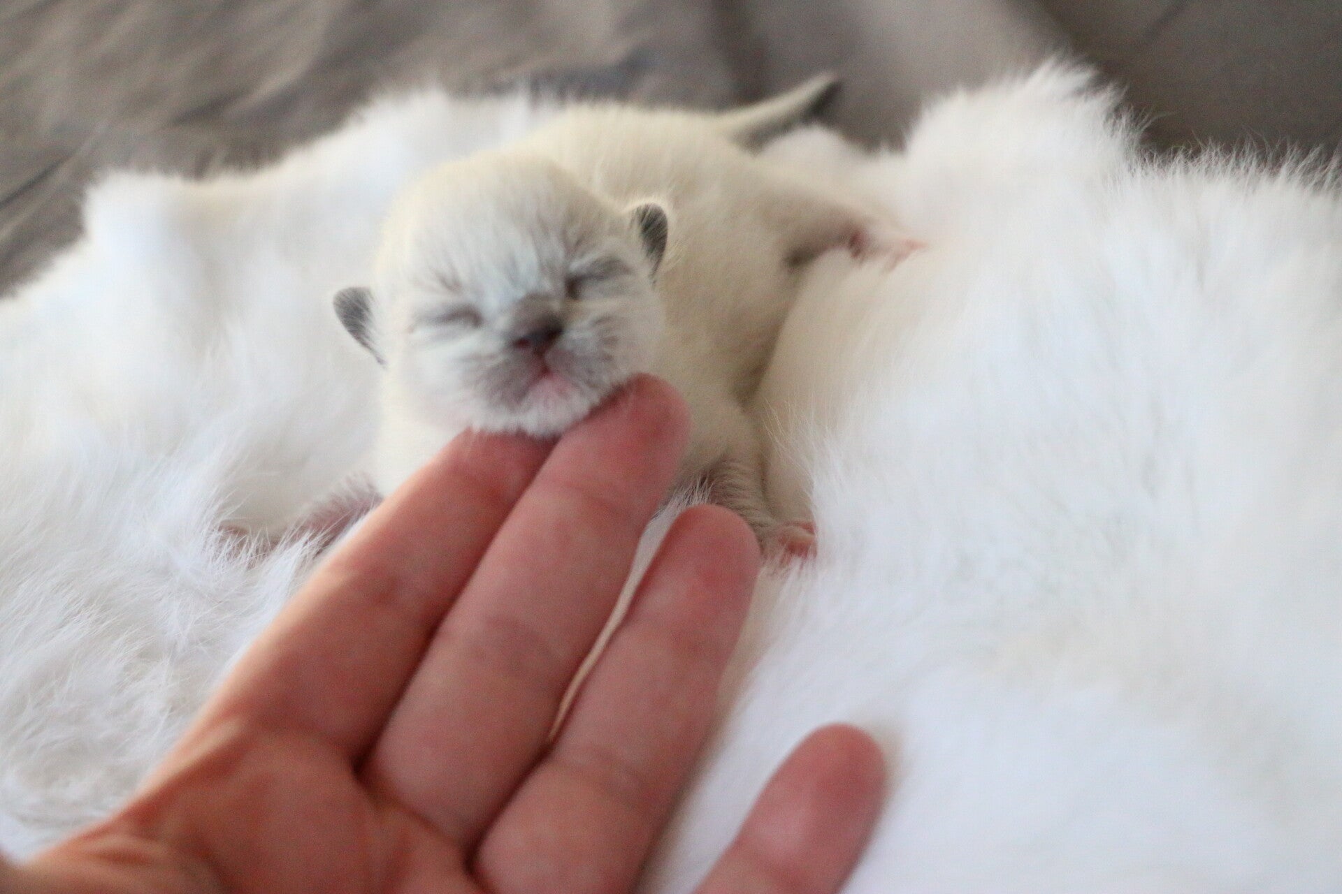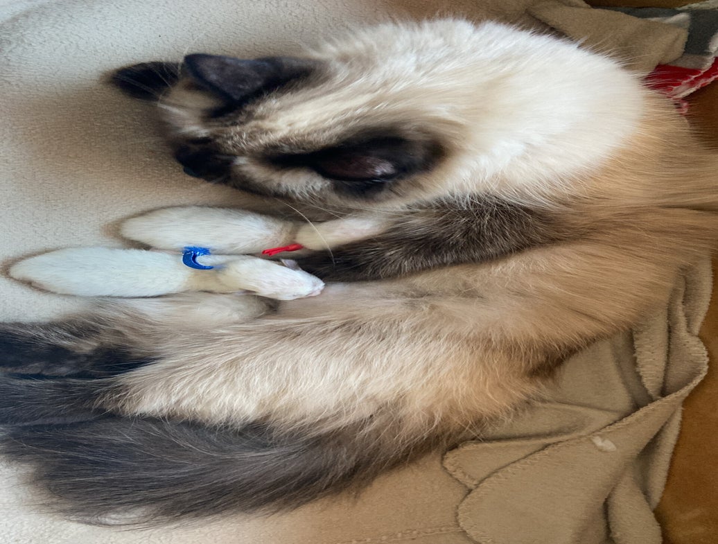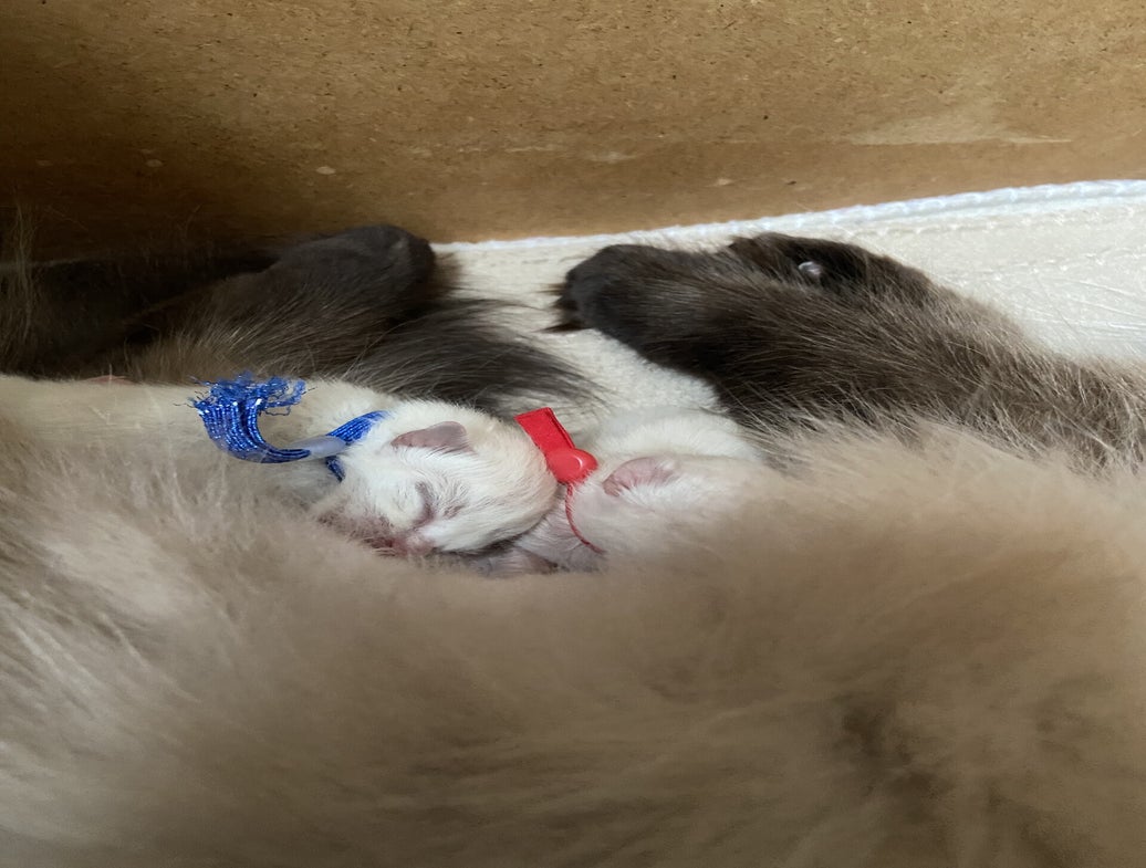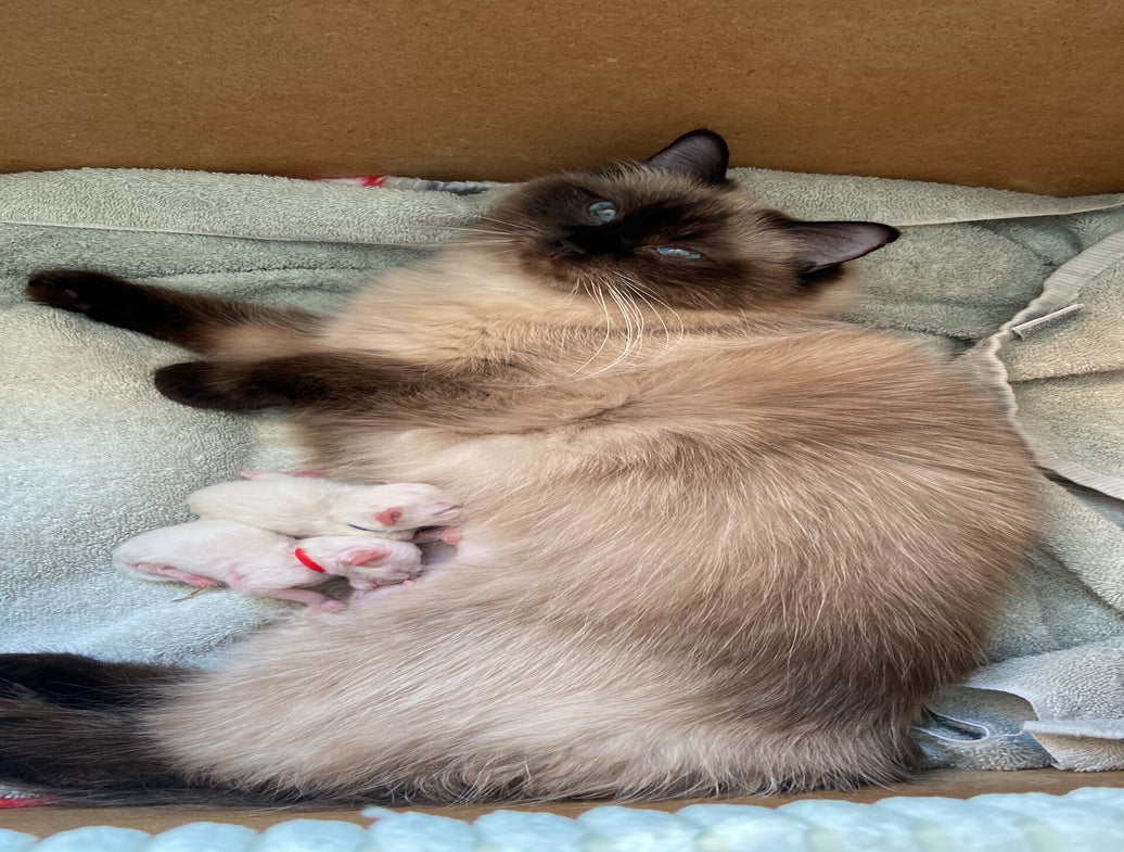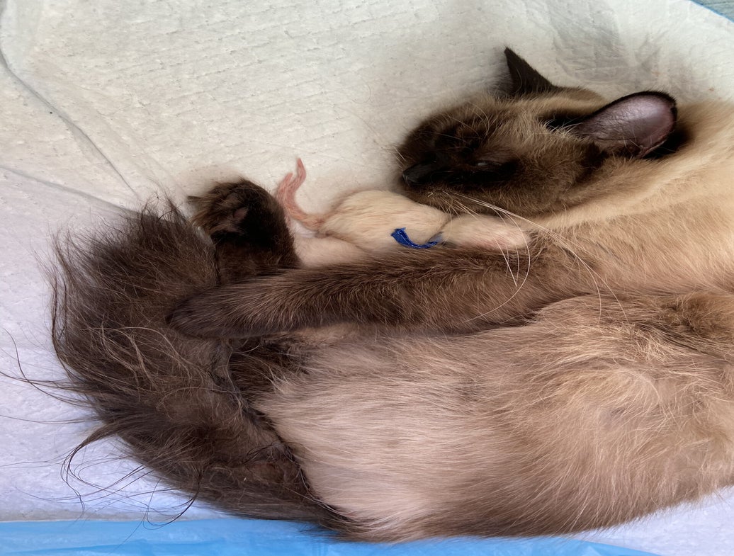 Na een redelijk snelle bevalling van de eerste 3 kittens, waarvan helaas de eerste doodgeboren was, had Paige het heel lastig bij het 4e kitten. Het meisje lag helaas in stuitligging en moest helaas met een keizersnede worden gehaald. Met Paige en de andere twee kittens gaat het momenteel goed.